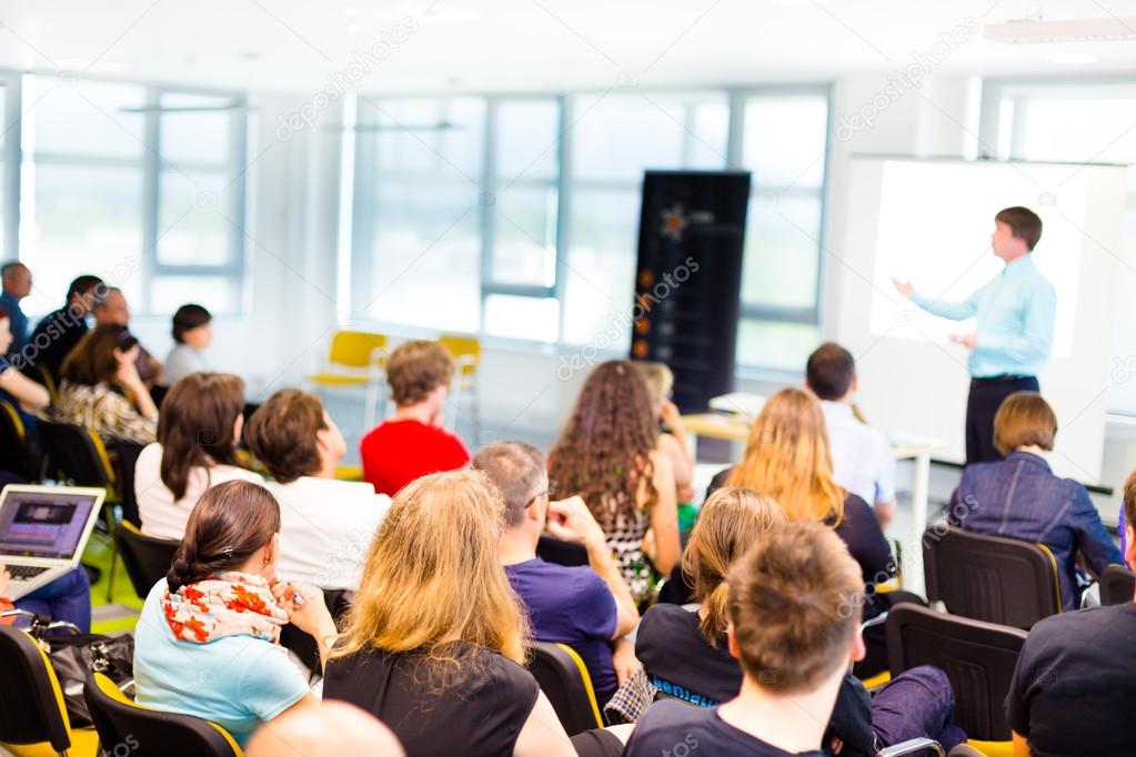 Докладчик на конференции и презентации. Аудитория в конференц-зале