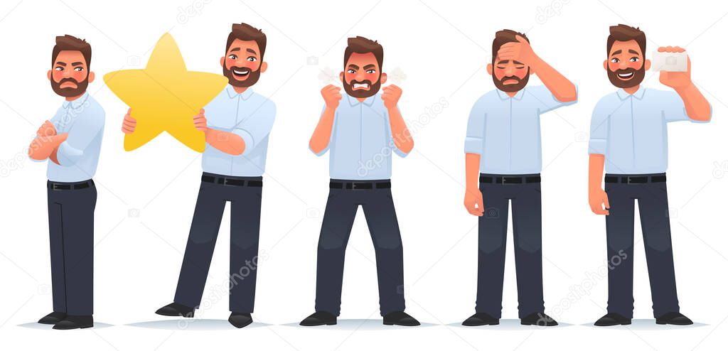 Набор характера человека. бизнесмен с чувством зависти, со звездой и оценивает свою работу, злой парень, уставший, показывает визитку. векторная иллюстрация в стиле мультфильма