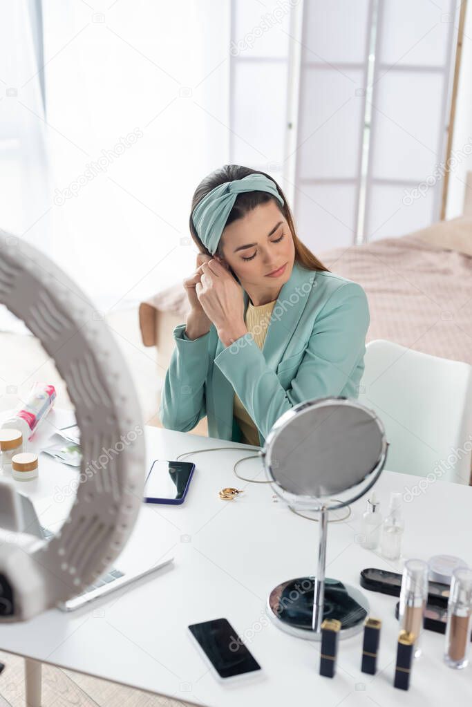 молодой блоггер красоты готовится к записи возле телефонного держателя и контейнеров с косметикой