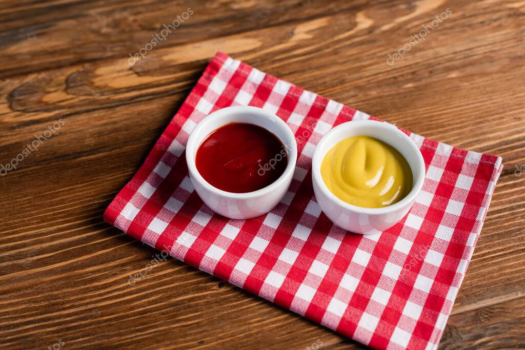 соус миски с кетчупом и горчицей на клетчатой салфетке и деревянный стол