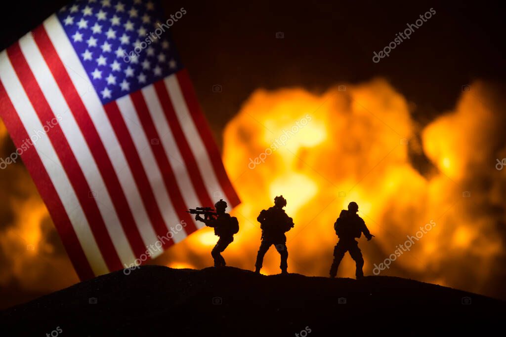 - Маленький флаг США на горящем темном фоне. Концепция кризиса войны и политических конфликтов между народами. Силуэт вооруженного солдата против флага США. Селективный фокус
