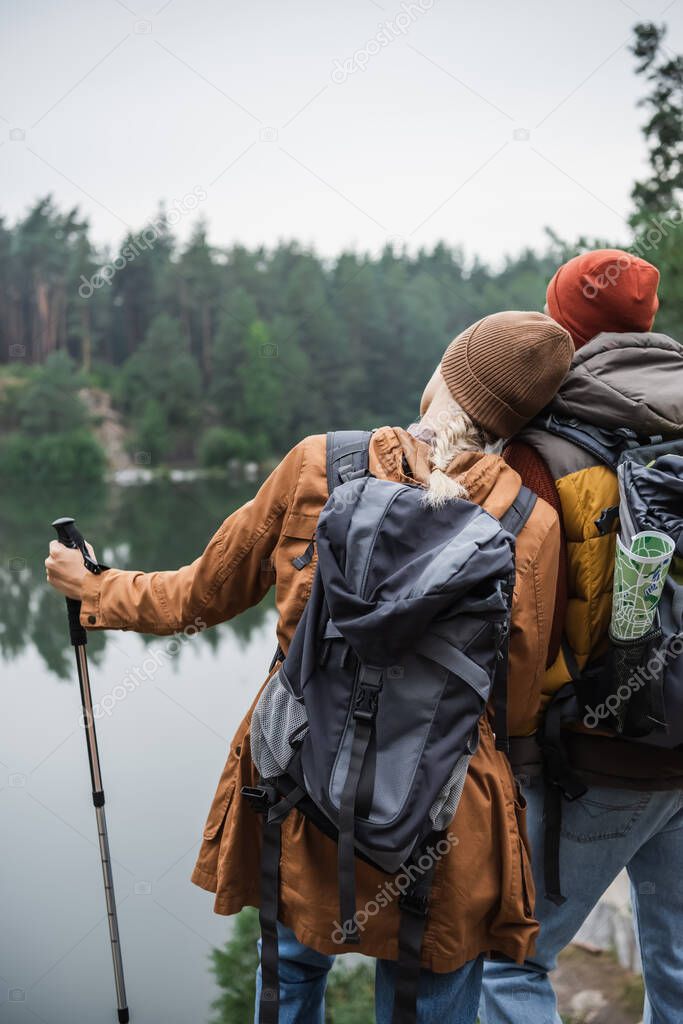 - Вид сзади женщины с рюкзаком, держащей трость и опирающейся на мужчину рядом с озером