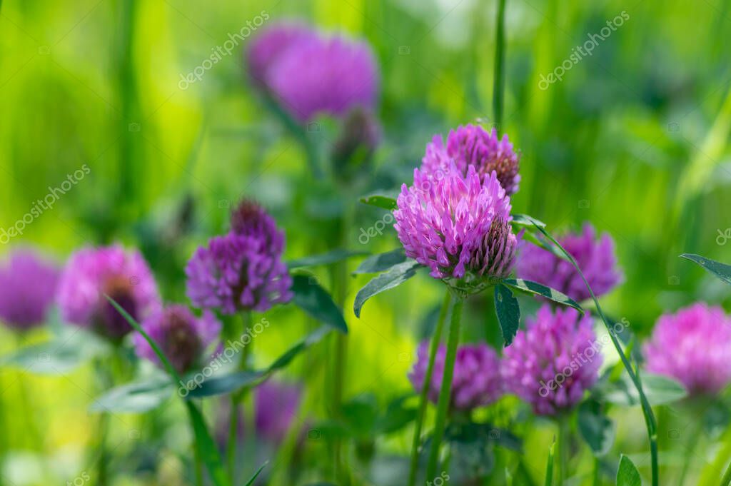 - Trifolium pratense красный клевер дикое цветущее растение, фиолетовый луг цветы в цвету, зеленые листья