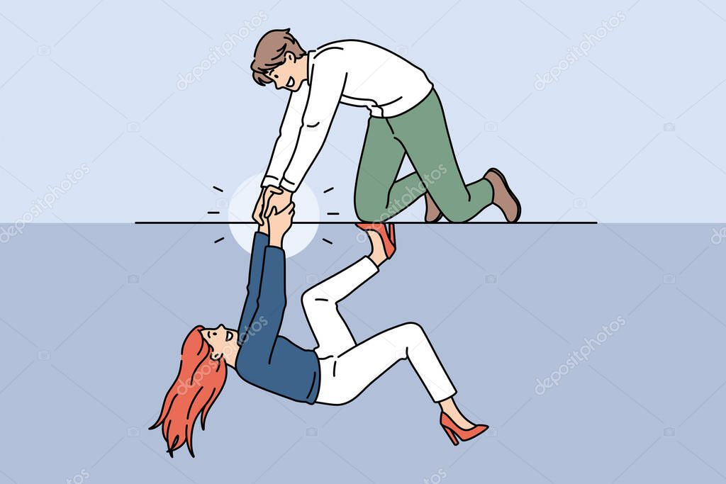 Помогает рука и концепция поддержки. Молодой улыбающийся мужчина персонаж мультфильма сидит на коленях и протягивает руку женщине, помогая ей взобраться на векторную иллюстрацию