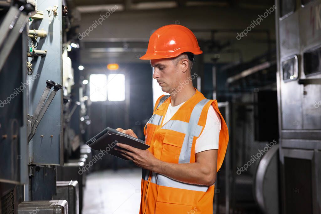 Профессиональный мужчина инженер тяжелой промышленности носить форму безопасности и с использованием планшетного компьютера. Промышленный специалист, работающий на металлоконструкционном производстве.