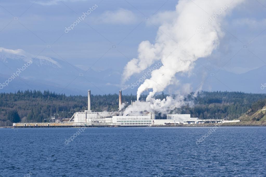 Горизонтальное фото завода или завода возле гор и воды с дымом и облаками