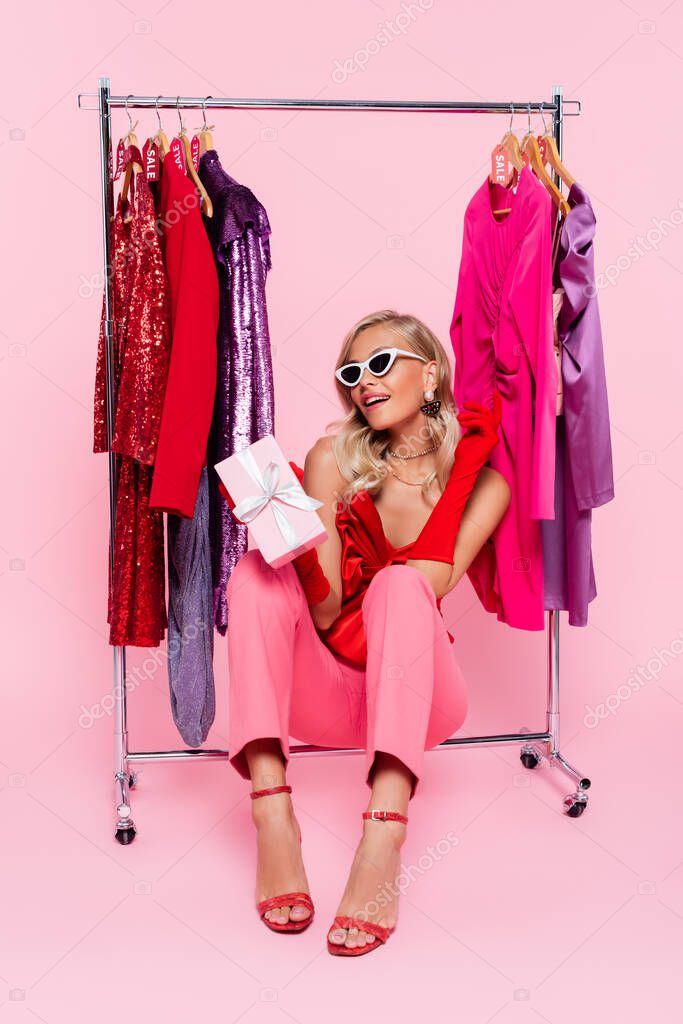 элегантная женщина сидит с подарочной коробкой рядом с ассортиментом модной одежды с ярлыками продажи на розовый