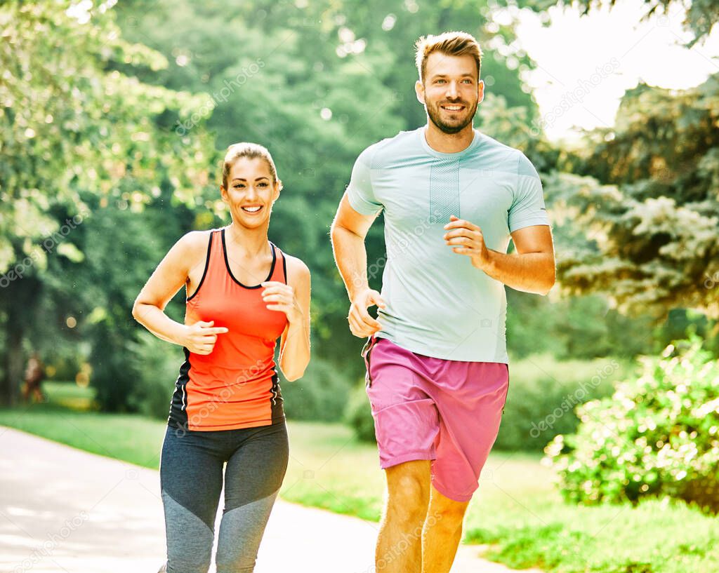 Портрет молодой пары, бегущей и занимающейся спортом в парке на открытом воздухе