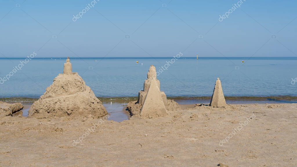 - Песчаные замки на пляже Колобжег на польском побережье Балтийского моря летом