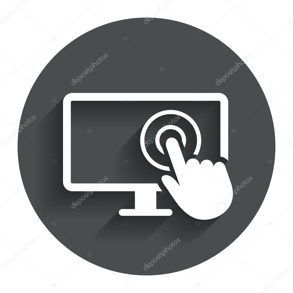 Значок сенсорного монитора. Символ указателя руки. Круговая плоская кнопка с тенью. Современная навигация по сайту. Вектор
