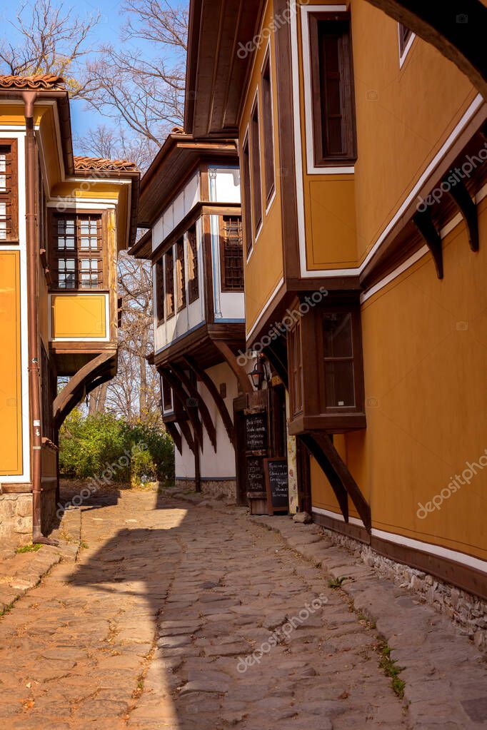- Пловдив, Болгария - 25 ноября 2021 года: красочные средневековые дома, улица в старом городе