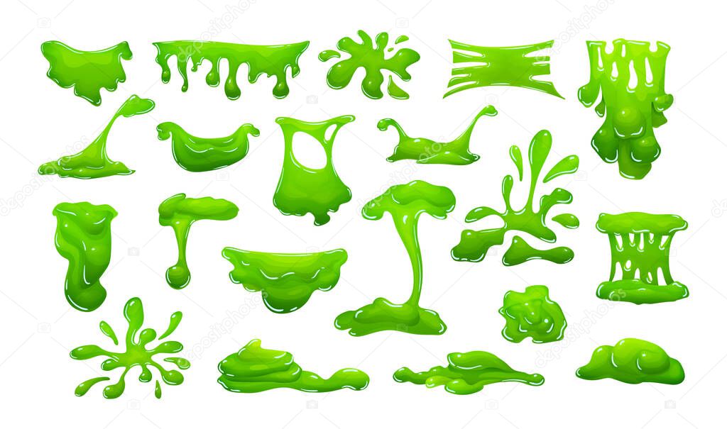 - Реалистичная зеленая слизь в форме капельного пятна размывает пятна. Зеленая слизистая жидкость, которая капает, растягивается. Радиоактивные пятна и капли векторной карикатуры
