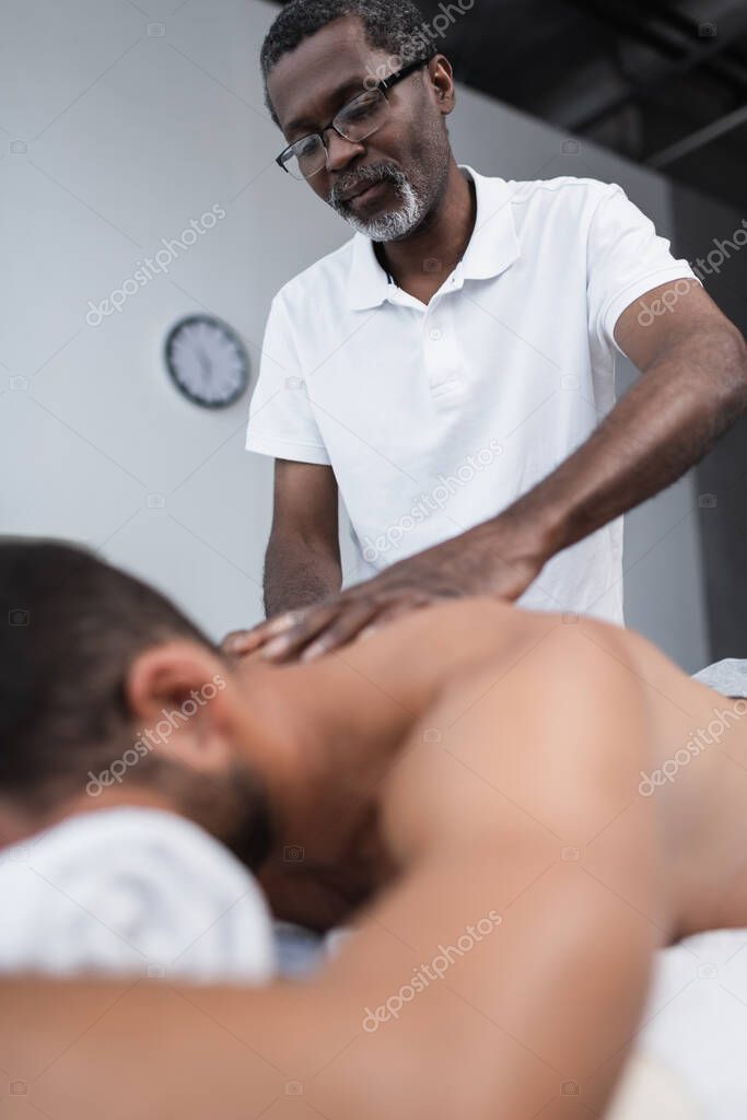 низкий угол обзора африканского американского массажера, делающего массаж спины во время реабилитации размытого человека