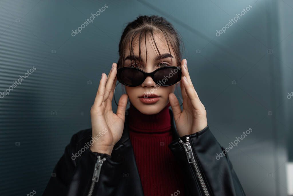 Стильный портрет красивой молодой женщины в модной черной кожаной куртке с молнией в бордовом свитере выпрямляет солнечные очки в городе, смотрит в камеру