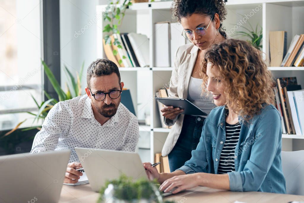 Выстрел успешной бизнес-многопользовательской команды, стоящей вокруг компьютера для презентации работы в коворкинговом пространстве.