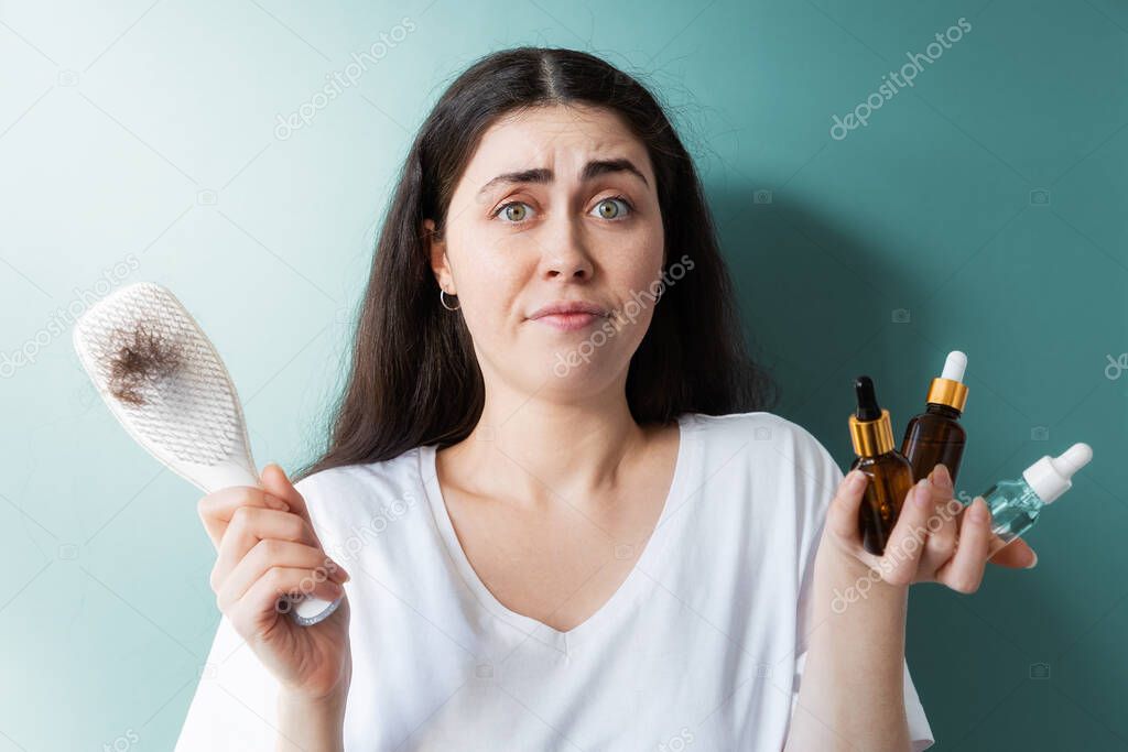 Портрет возмущенной брюнетки держит в руках расческу и косметику. Бирюзовый фон. Понятие проблем с волосами.