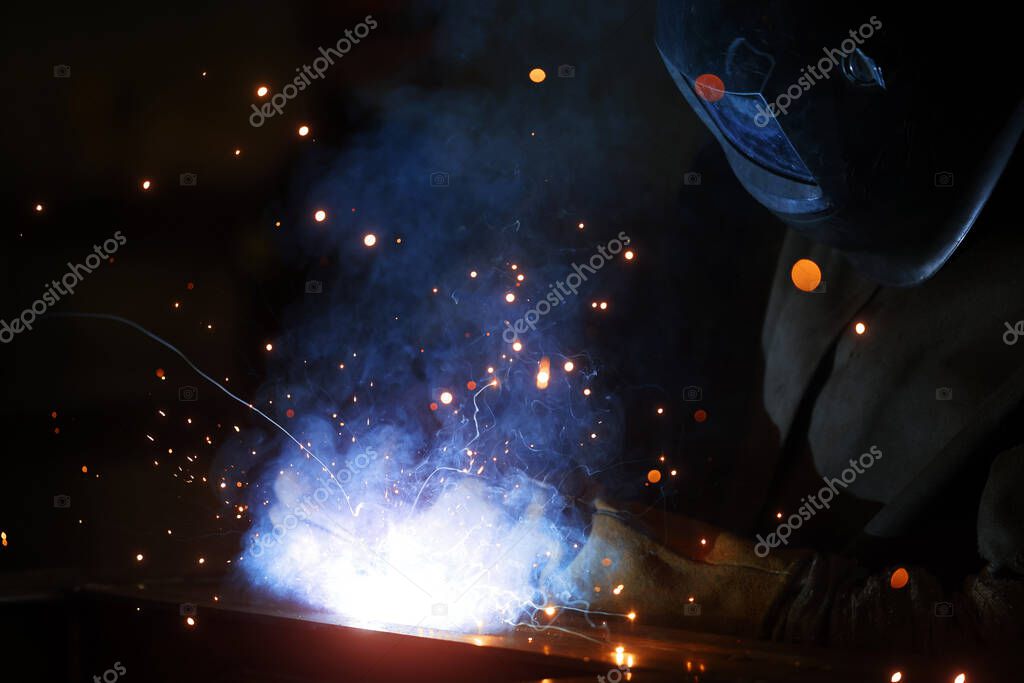 - Сварщик на работе. Сварка металлических искр и дыма в мастерской. Промышленный сварщик с газовой горелкой в защитном шлеме, сварочные металлические профили. Сварка на строительной площадке