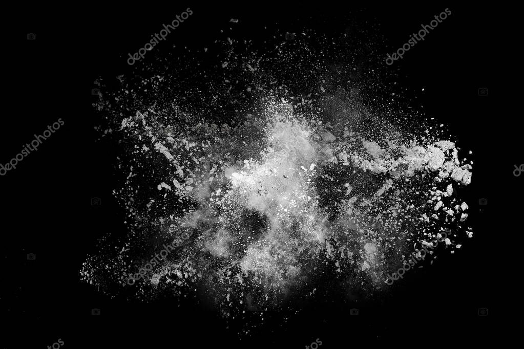 Взрыв белого пороха на черном фоне. Цветное облако. Разноцветная пыль взрывается. Холи, Пейнт.