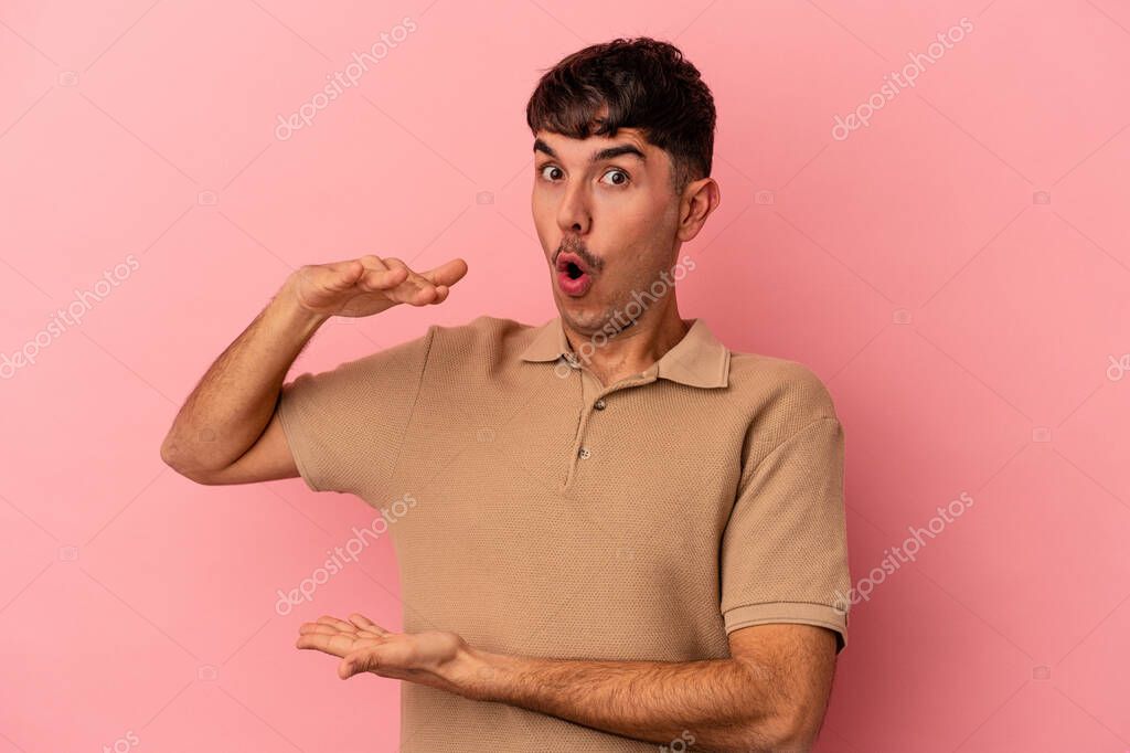 - Молодой смешанной расы человек изолирован на розовом фоне держа что-то обеими руками, презентация продукта.