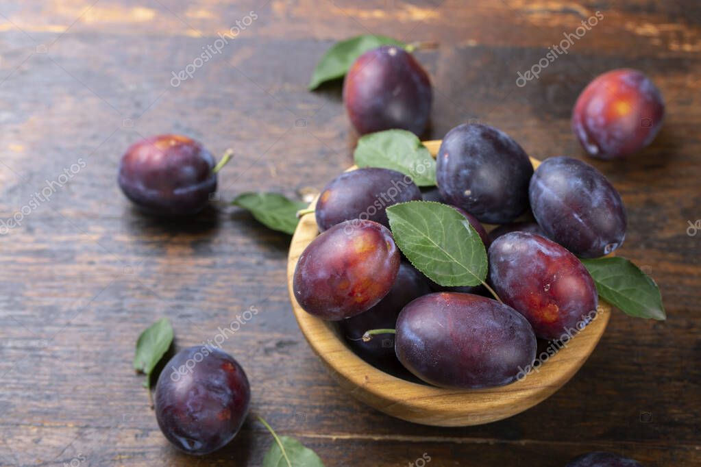 - Свежие сливы с листьями в деревянной чаше на коричневом столе. Сбор летнего урожая.