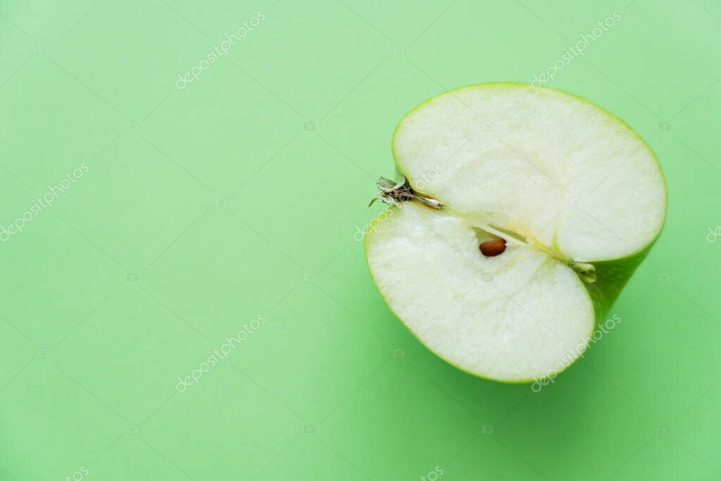- сверху вид свежего сочного яблока наполовину на зеленый