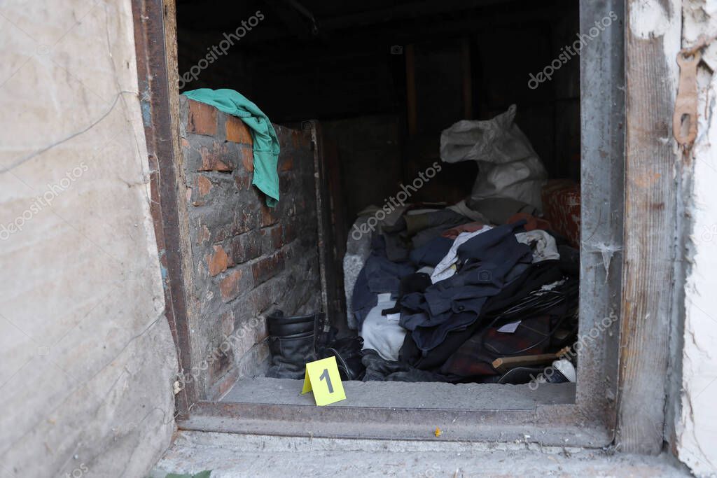 - Улики с желтым маркером криминалиста для нумерации улик на заднем дворе дома вечером. Концепция процесса расследования преступления