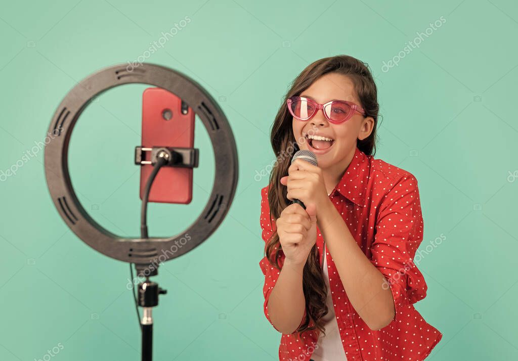 счастливый влоггер с микрофоном. создание видеоблога на смартфоне. Блог лампы. Урок вокала онлайн. Подростковая певица использует селфи во главе. детский музыкальный блогер. Караоке. детская песня.