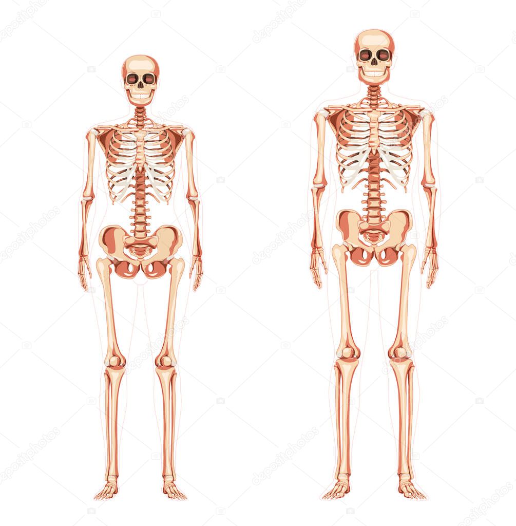 - Набор женщин и мужчин Скелет Человеческие кости тела мужчины и женщины. Леди и джентльмены вид спереди. 3D реалистичная концепция плоская девушка и мальчик концепция Векторная иллюстрация анатомии изолированы на белом