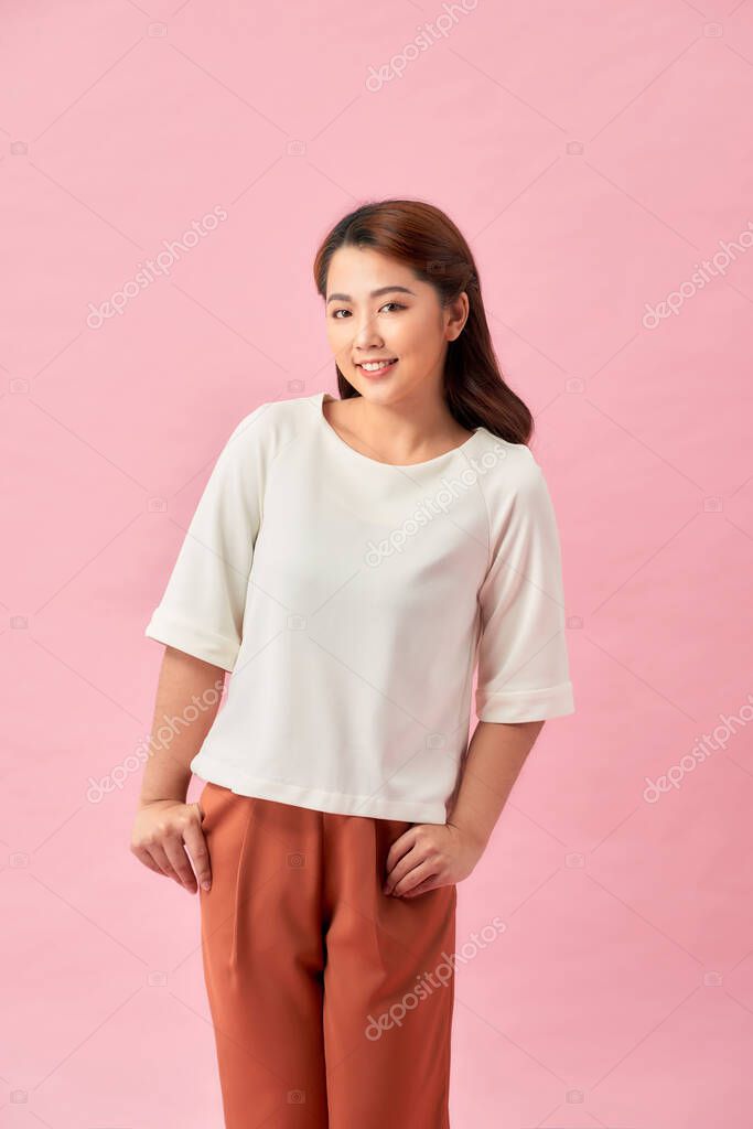 Портрет счастливой улыбающейся молодой красивой женщины, изолированной на розовом фоне