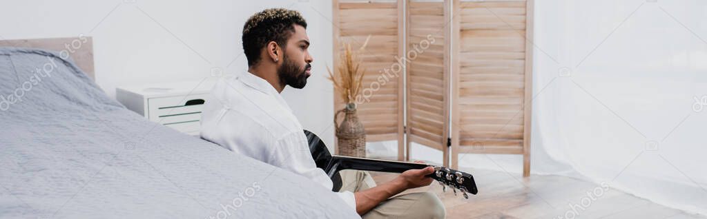 бородатый и молодой африканский американец играет на акустической гитаре возле кровати, баннер