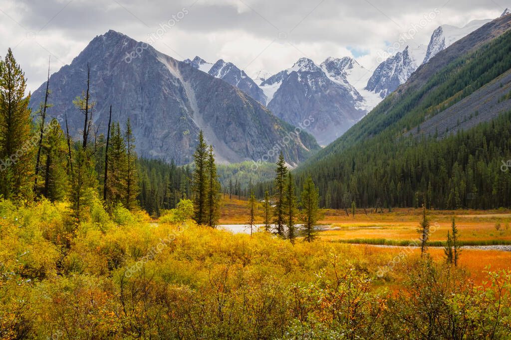 - Яркий солнечный осенний пейзаж с солнечной золотой долиной и извилистой рекой с зелеными елками на склоне горы под голубым небом. Удивительные альпийские пейзажи с красивыми горами под золотым солнцем.