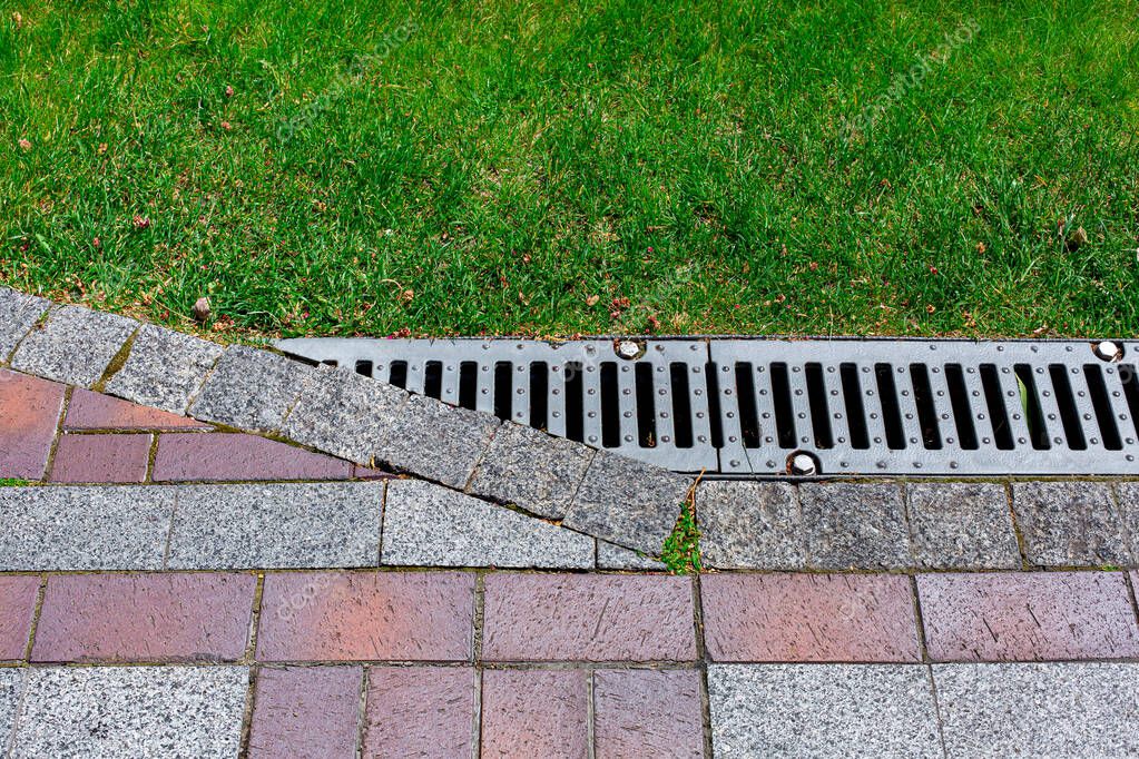 - решетка дренажной решетки, прикрученная к ливневой канализации в углу тротуара из камня кирпичной плитки красного и серого цвета с узором на заднем дворе с травой крупным планом инженерных сооружений сада.