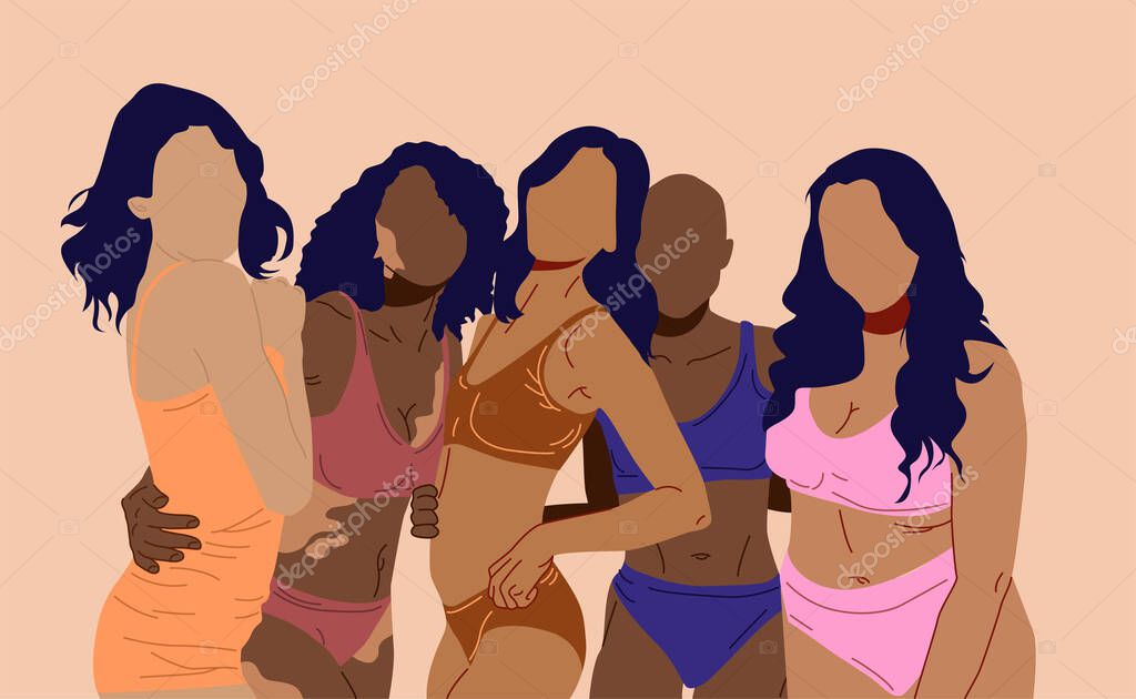 - Многорасовые женщины разного роста, типа фигуры и размера, одетые в купальники. Счастливые женщины в купальниках, бикини. Разные привлекательные женщины позируют. Тело положительное. Векторная миграция