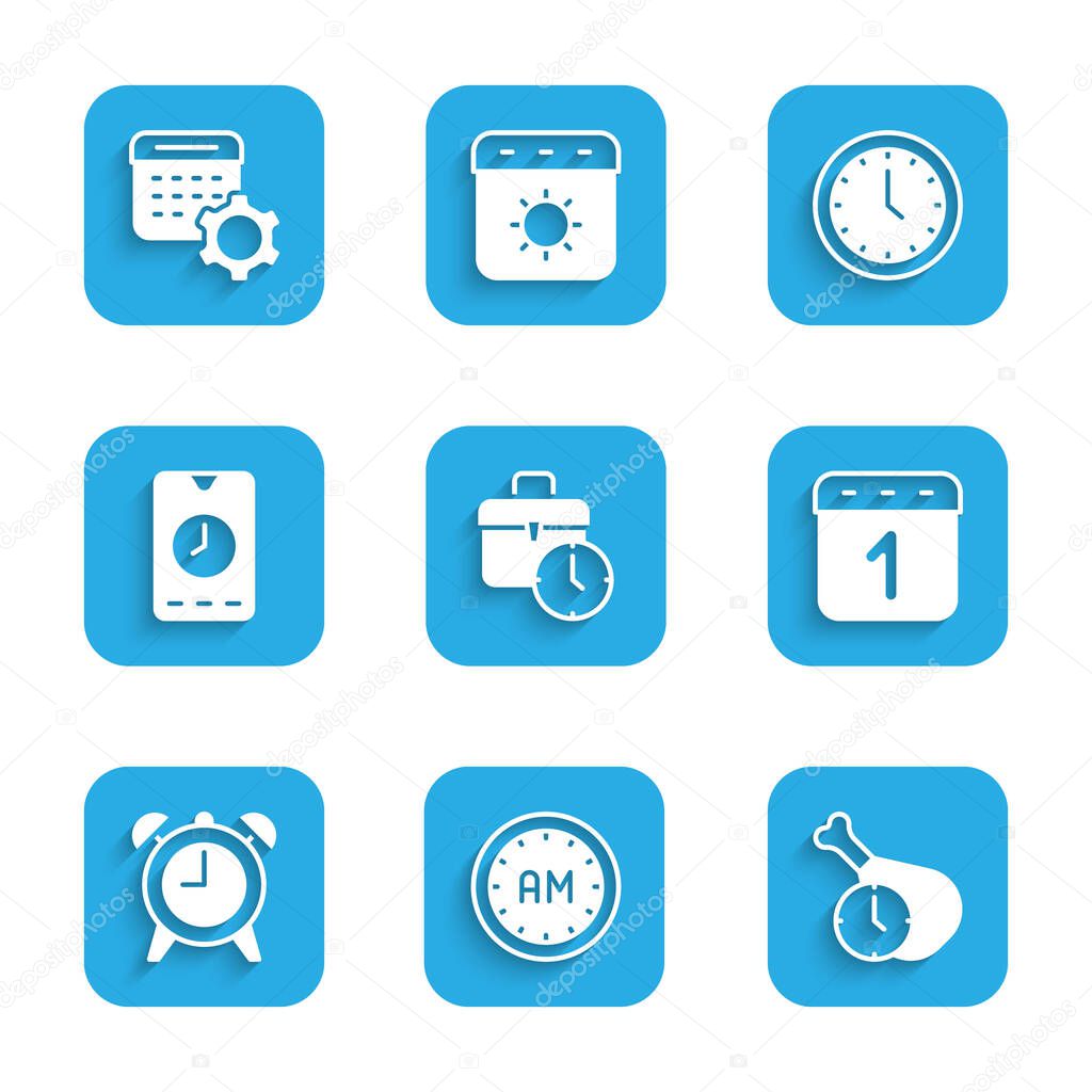 Set Work time Morning Food Calendar Alarm clock app mobile Clock and settings icon. Vector.