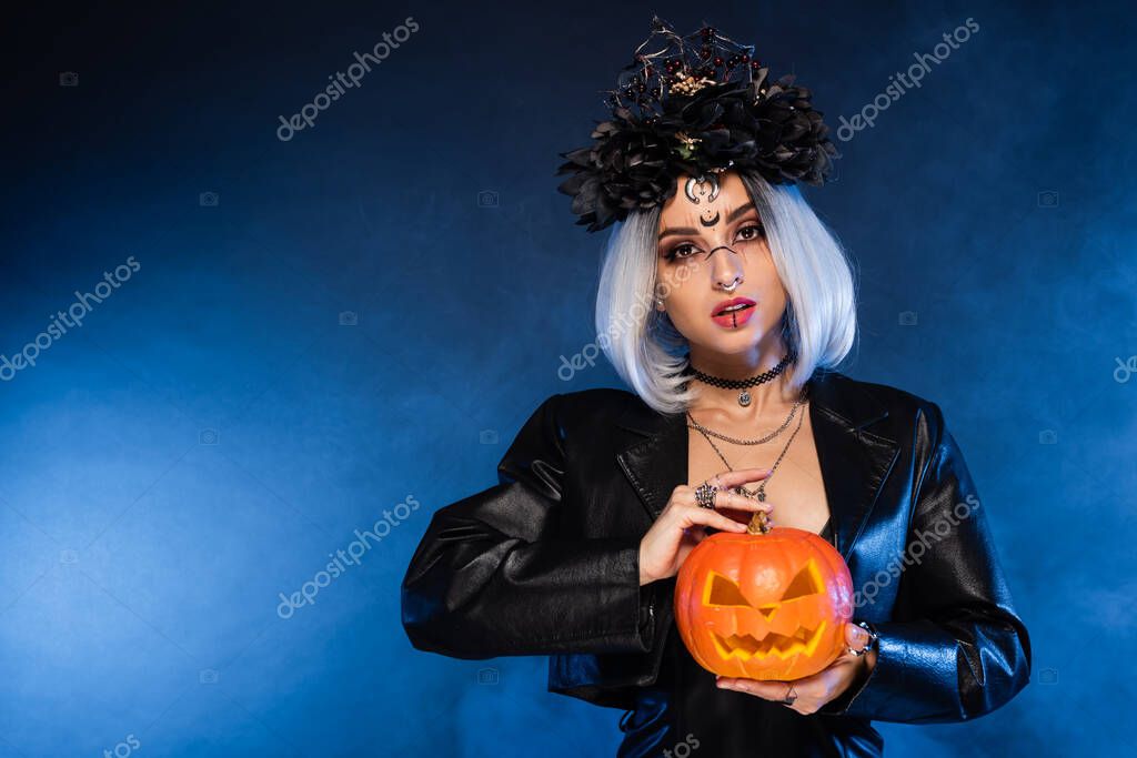 молодая ведьма в черном венке держит резную тыкву рядом с синим туманом на темном фоне
