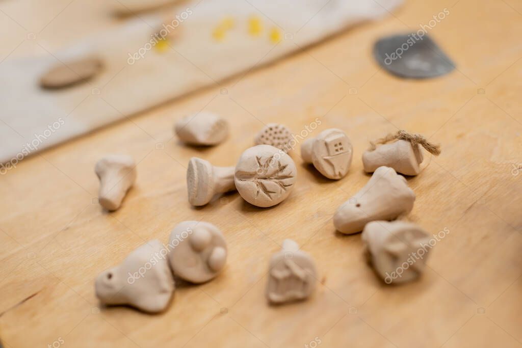 Крупный план глиняных сувениров на столе в керамической мастерской