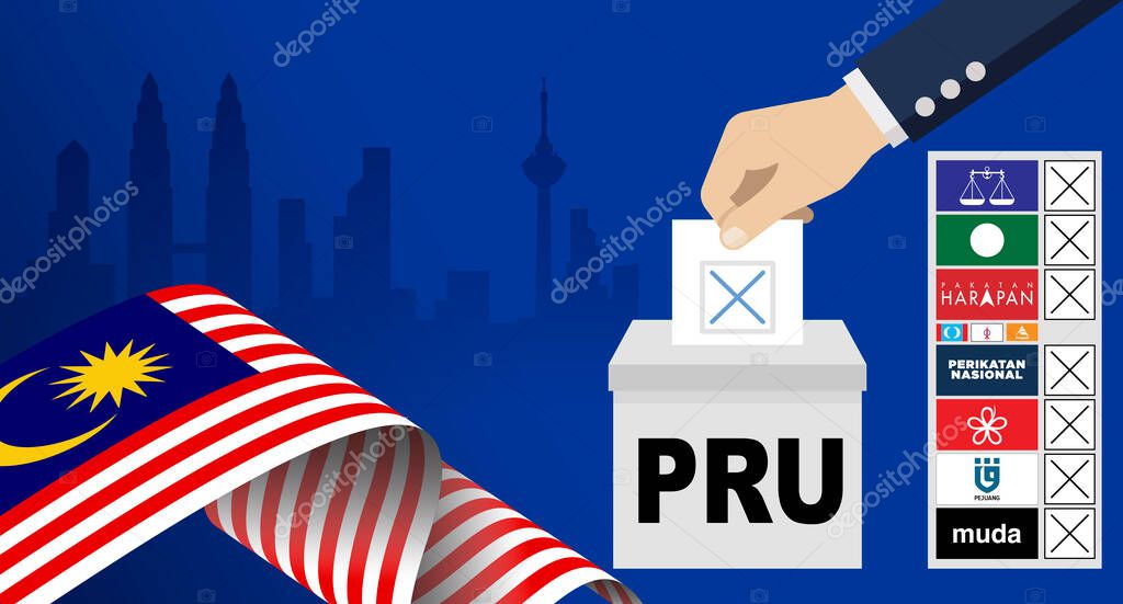 - Концепция Дня Всеобщих выборов, известная как PRU. Флаг Малайзии и городской пейзаж Куала-Лумпура