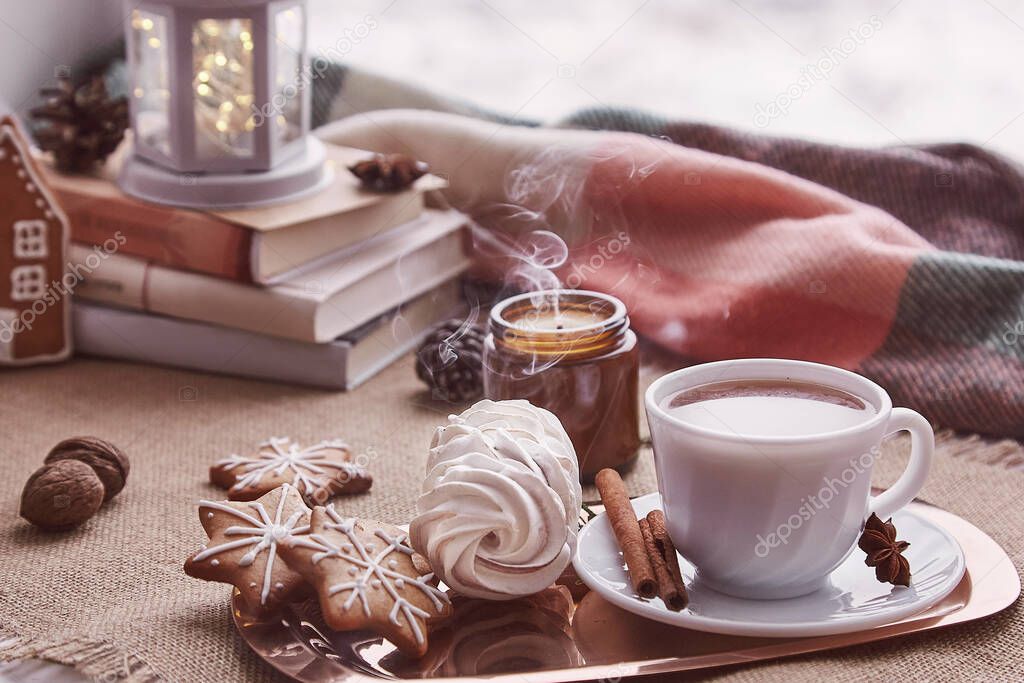 - Зимнее эстетическое утро в снежный день. Рождественская атмосфера дома с книгами, фонарик, свечи, имбирное печенье, зефир, чашка кофе фон.