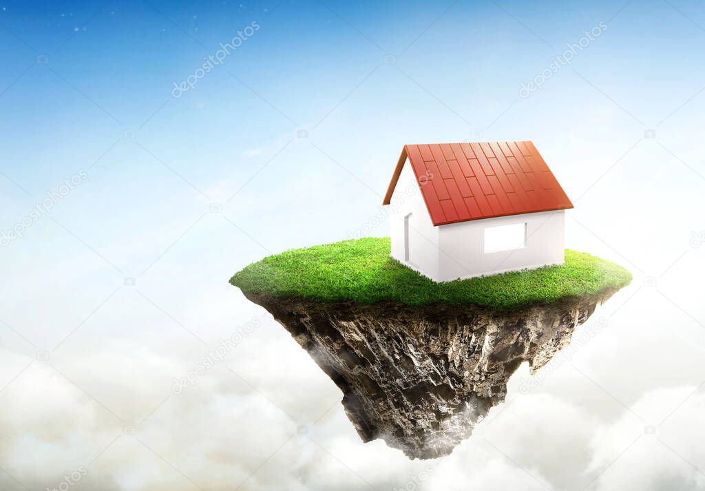 Модель дома в круглом сечении грунта с зеленой травой. фантазии плавучий остров природный ландшафт с раем концепции на вершине голубого неба. Продажа недвижимости или концепция инвестиций в недвижимость. 3d