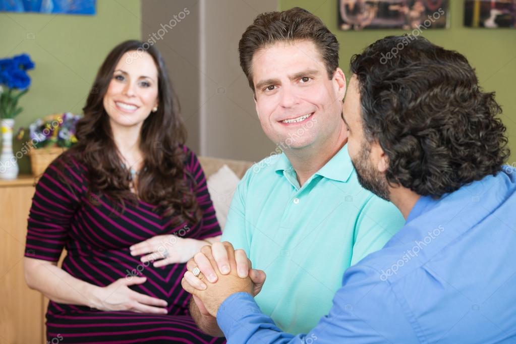 Счастливый мужчина с партнером и ожидающая белая женщина