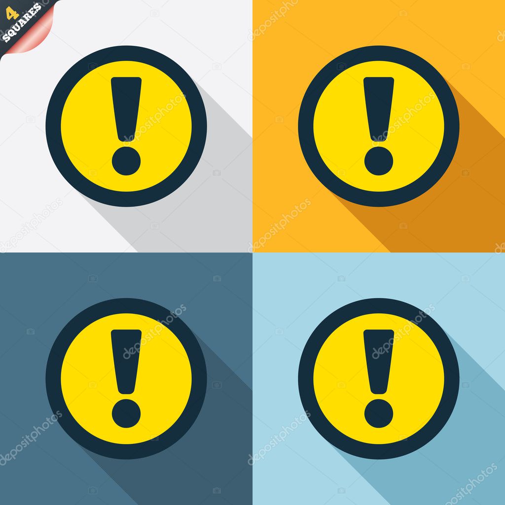 Знак внимания. Восклицательный знак. Предупреждающий символ опасности. Четыре квадрата. Цветные кнопки плоского дизайна. Вектор