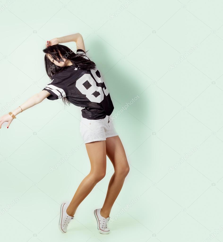 - Молодая энергичная спортивная активная девушка танцует в Студии на светлом фоне в футболках и шортах