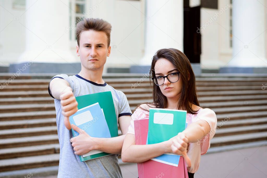 Грустное недовольство недовольных молодых студентов, показывающих большие пальцы, стоящих перед старым традиционным университетом. Концепция плохого обучения, плохой университет