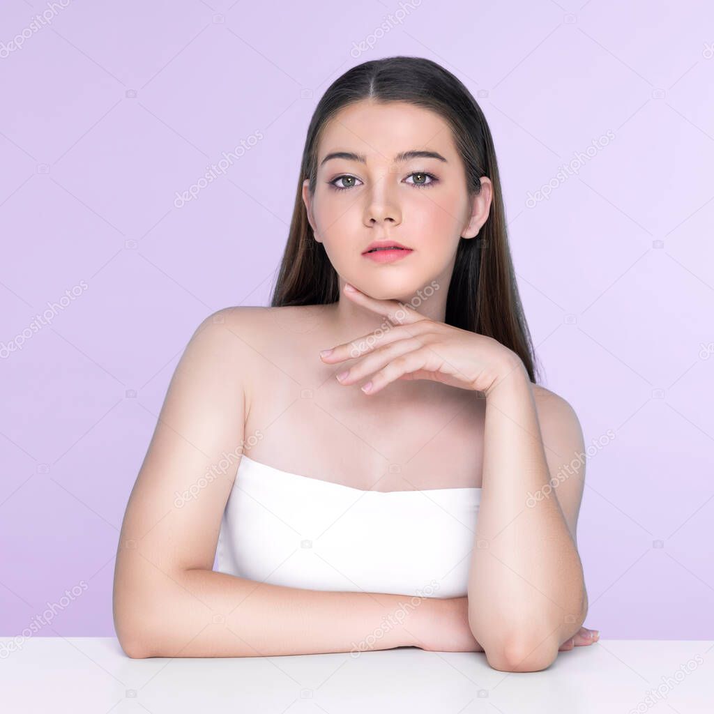 Портрет юной брюнетки с длинными волосами и безупречной кожей с жестом руки для красоты и косметической концепции. очаровательная красивая молодая девушка позирует руки для кожи или косметической рекламы.