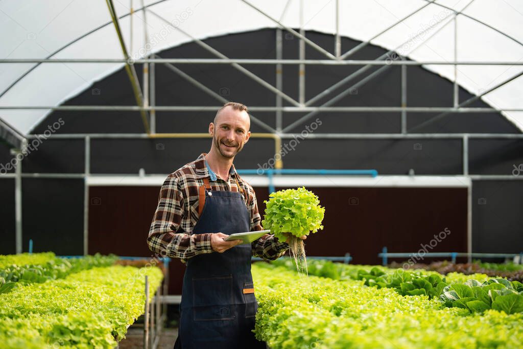 Владелец гидропоники овощной огород проверяет качество овощей и проверяет или регистрирует рост овощей в огороде, овощей в теплице...
