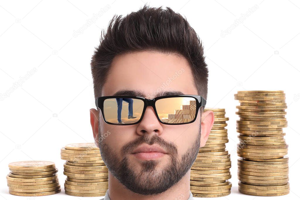 - Шаги к успеху. Уверенный в себе человек против сложенных монет на белом фоне. Бизнесмен поднимается по лестнице из деревянных блоков, отражение в солнцезащитных очках