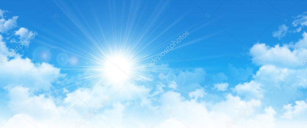 Синий фон неба с высоким разрешением. Солнце пробивается сквозь белые облака