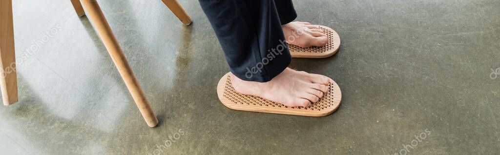 высокий угол зрения человека, ступающего босыми ногами на доске садху в студии йоги, баннер