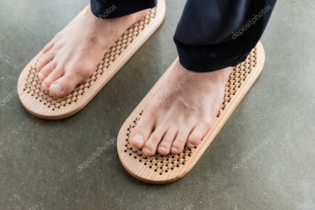 - Вид сверху на человека, стоящего босыми ногами на доске садху в студии йоги