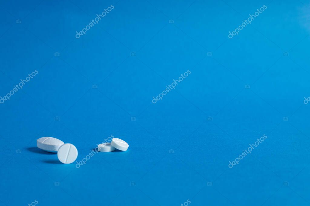 Круглые белые таблетки, крупным планом на голубом фоне. Принято. Предпосылки / контекст image on medical and pharmaceutical subjects
